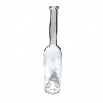 Botella pequeña de cristal con cuello alargado.