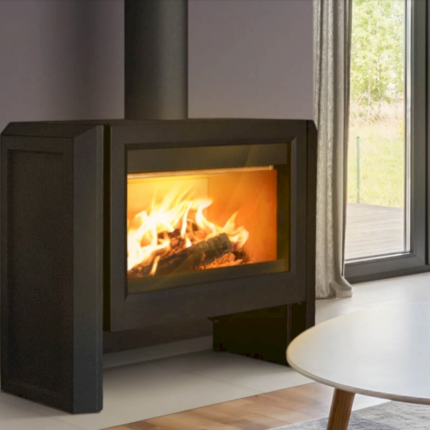 Estufa de leña de hierro fundido modelo Leon de Lacunza sobre estructura de acero.